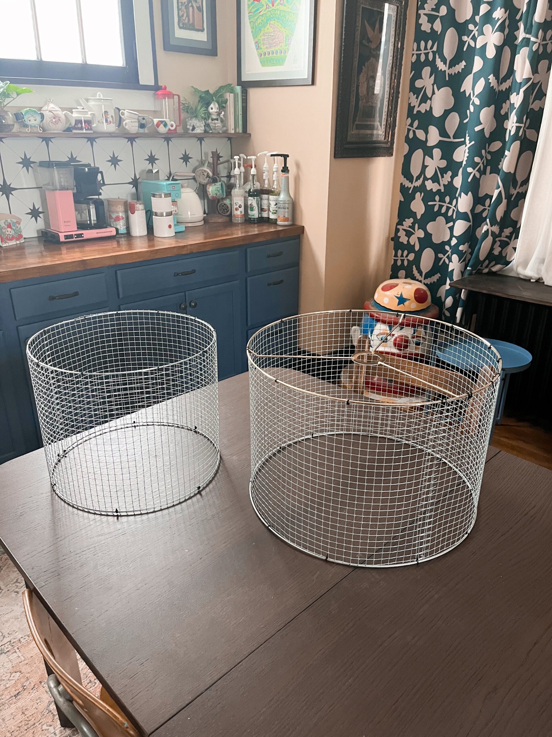For our dining room I wanted to buy a bird cage hanging light. The only ones I could find were super expensive (I am sure worth every penny) but only one tiered, and because of the high ceilings and the fact that it goes above our dining room table I wanted something with two tiers, so I decided to make one myself.