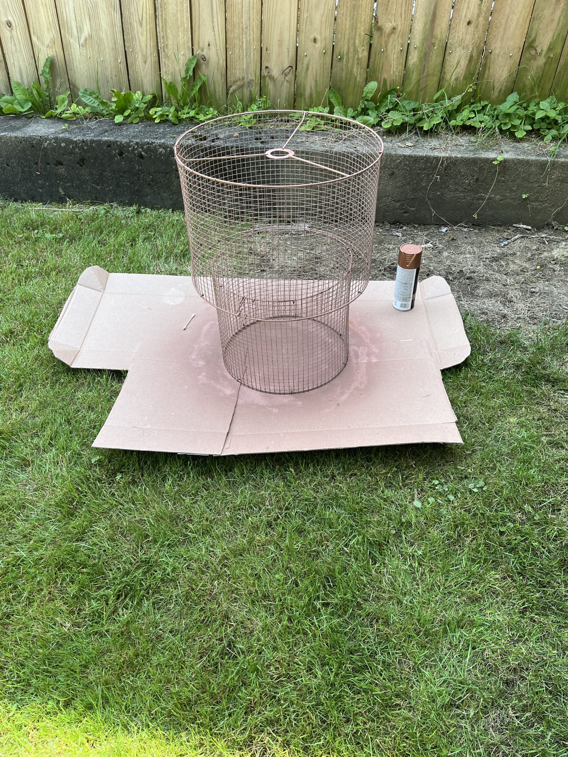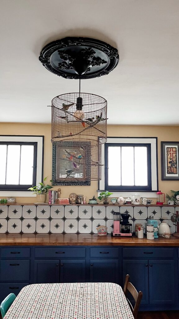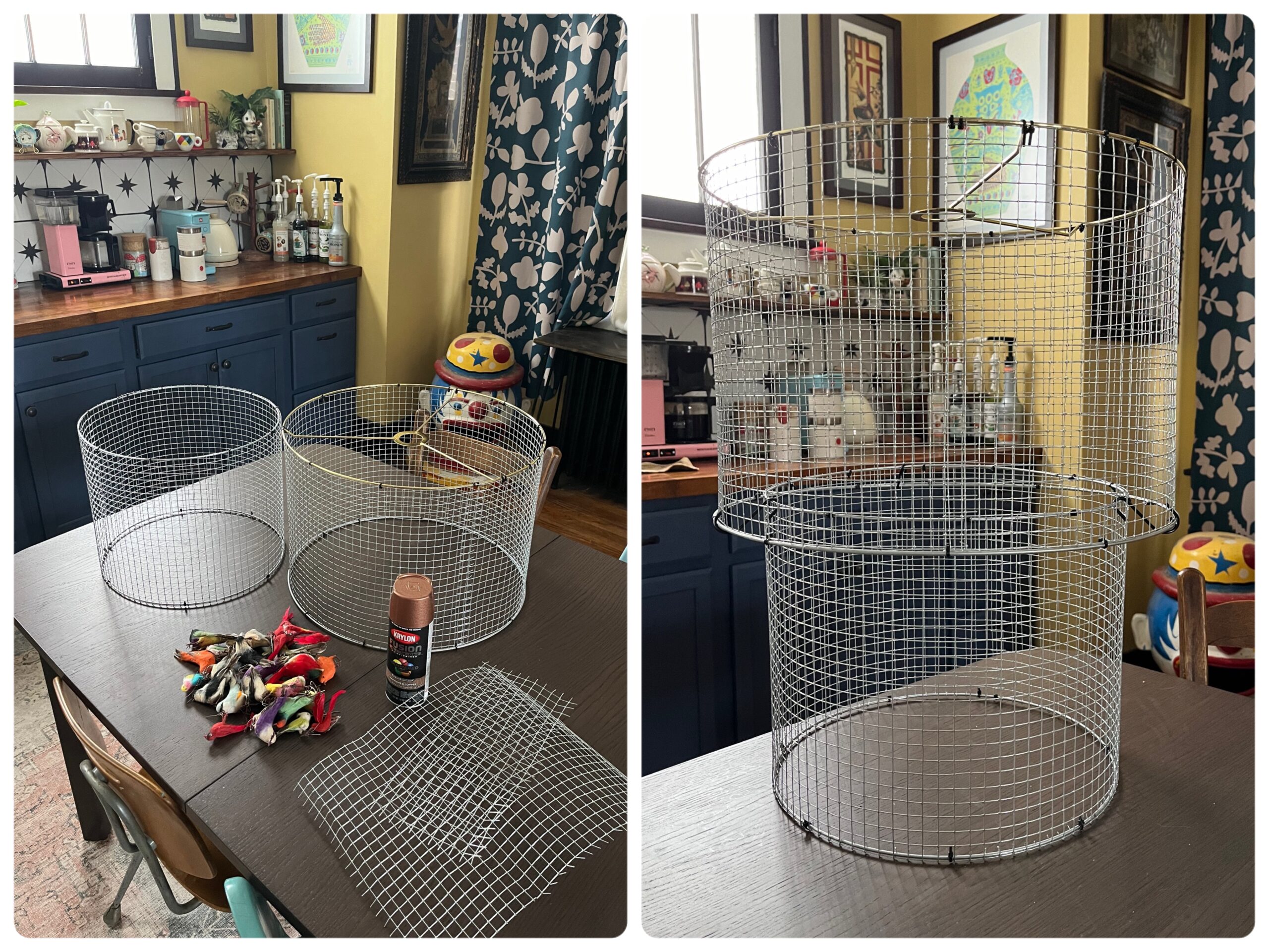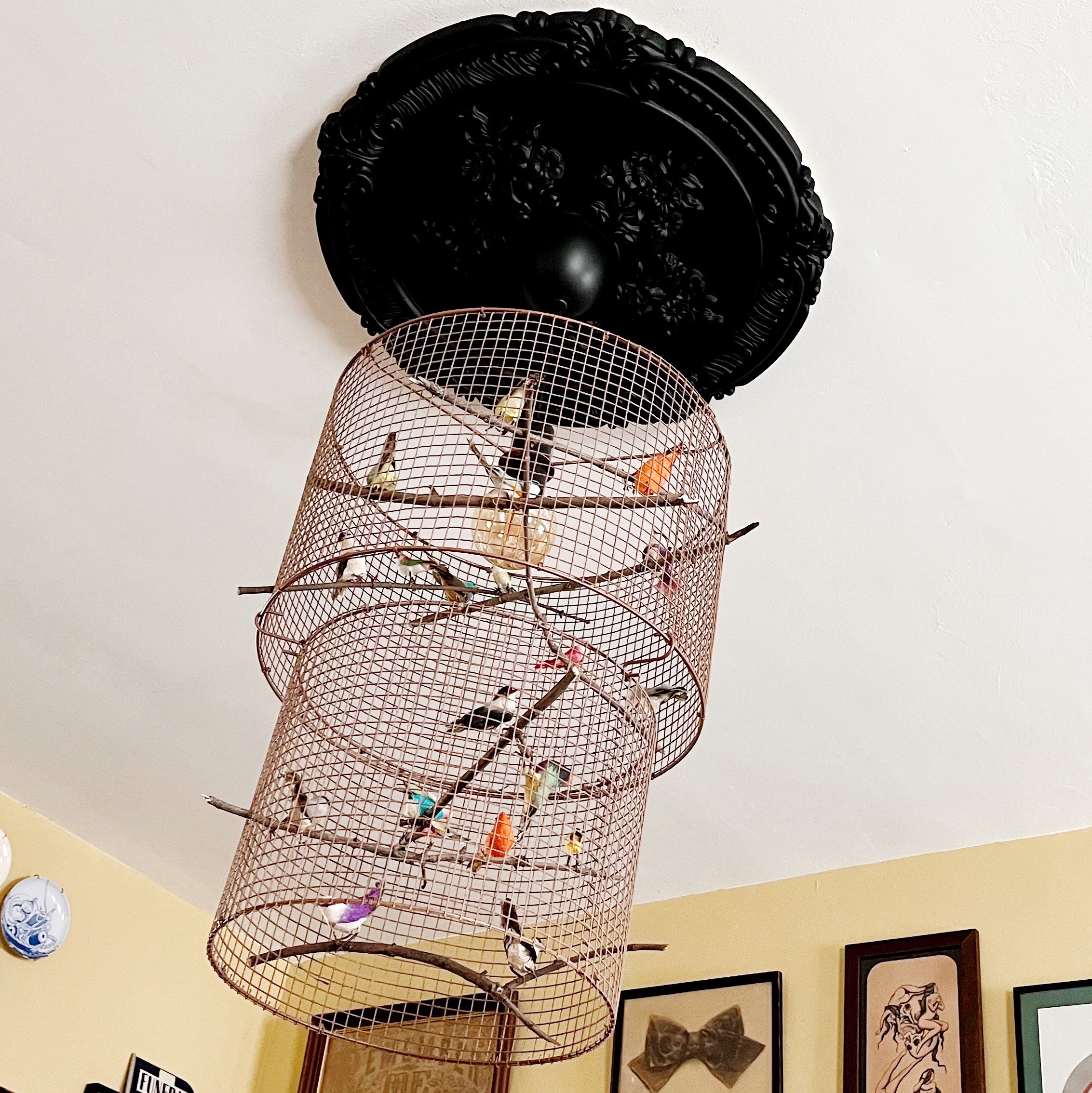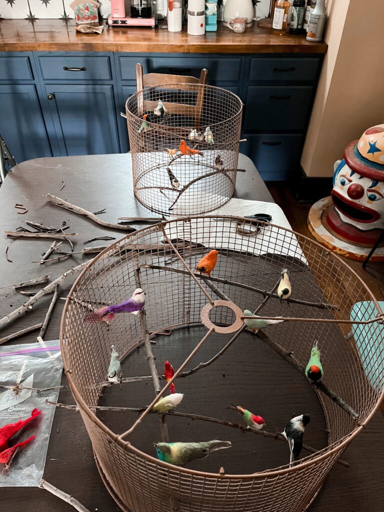 I bought 2 different size lamp ring kits and cut the bulb holder area off the smaller one so it was just two rings. I wrapped them in chicken wire bending the tiny edge prongs from cutting to hold onto the rings, but then also added tiny zip ties to keep the rings in place. I trimmed the tails of the zip ties so once painted you wouldn’t even notice them. To attach the big part of the lamp to smaller I used 3 S hooks I already owned. This is nice because you can take it apart as needed. I spray painted the whole thing with Krylon Fusion Hammered Copper spray paint. Then added sticks from my yard and vintage birds that I bought as a lot on ebay. Lastly I used a big bulb and light kit from Ikea.