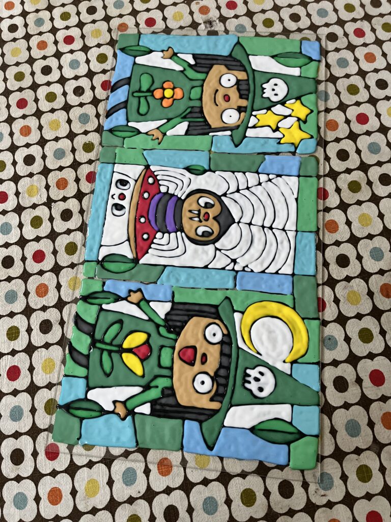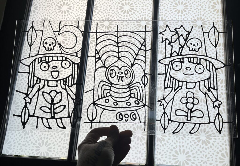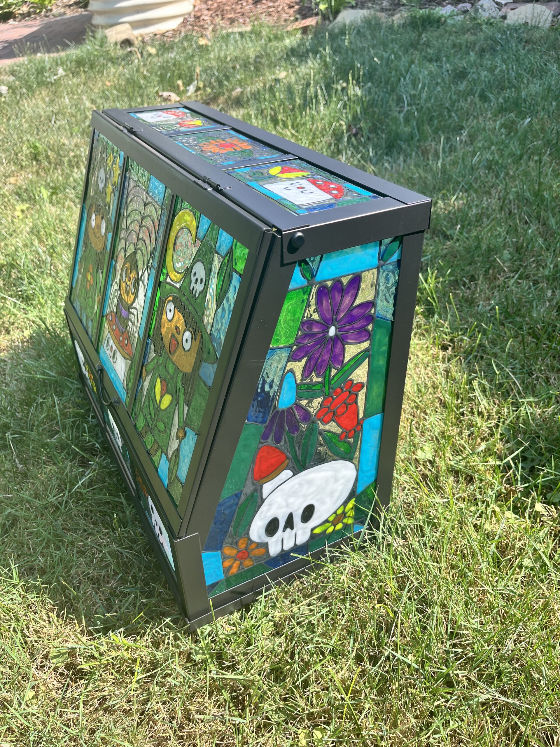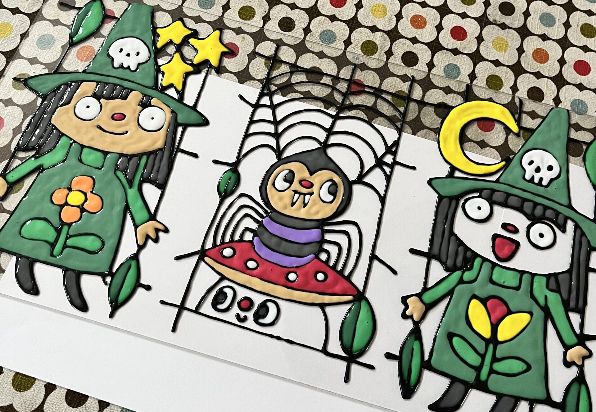 For Christmas I made a faux stained glass terrarium for my sister. She always says she likes my twin witch girls so I made them the focus. I used this Ikea greenhouse, and these paints. They were really easy to use, and the thing that takes the longest is just waiting for it to dry.
